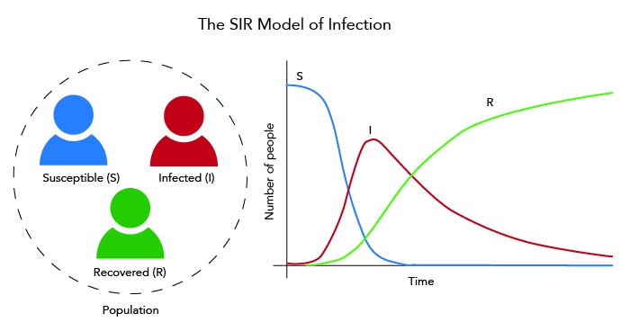 dSdt=−βSI\frac{dS}{dt} = – \beta S I dIdt=βSI−γI\frac{dI}{dt} = \beta S I – \gamma I dRdt=γI\frac{dR}{dt} = \gamma I